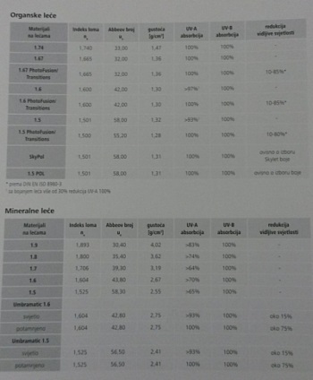 Tehnički podaci o Zeiss materijalima (plastičnim i mineralnim lećama):